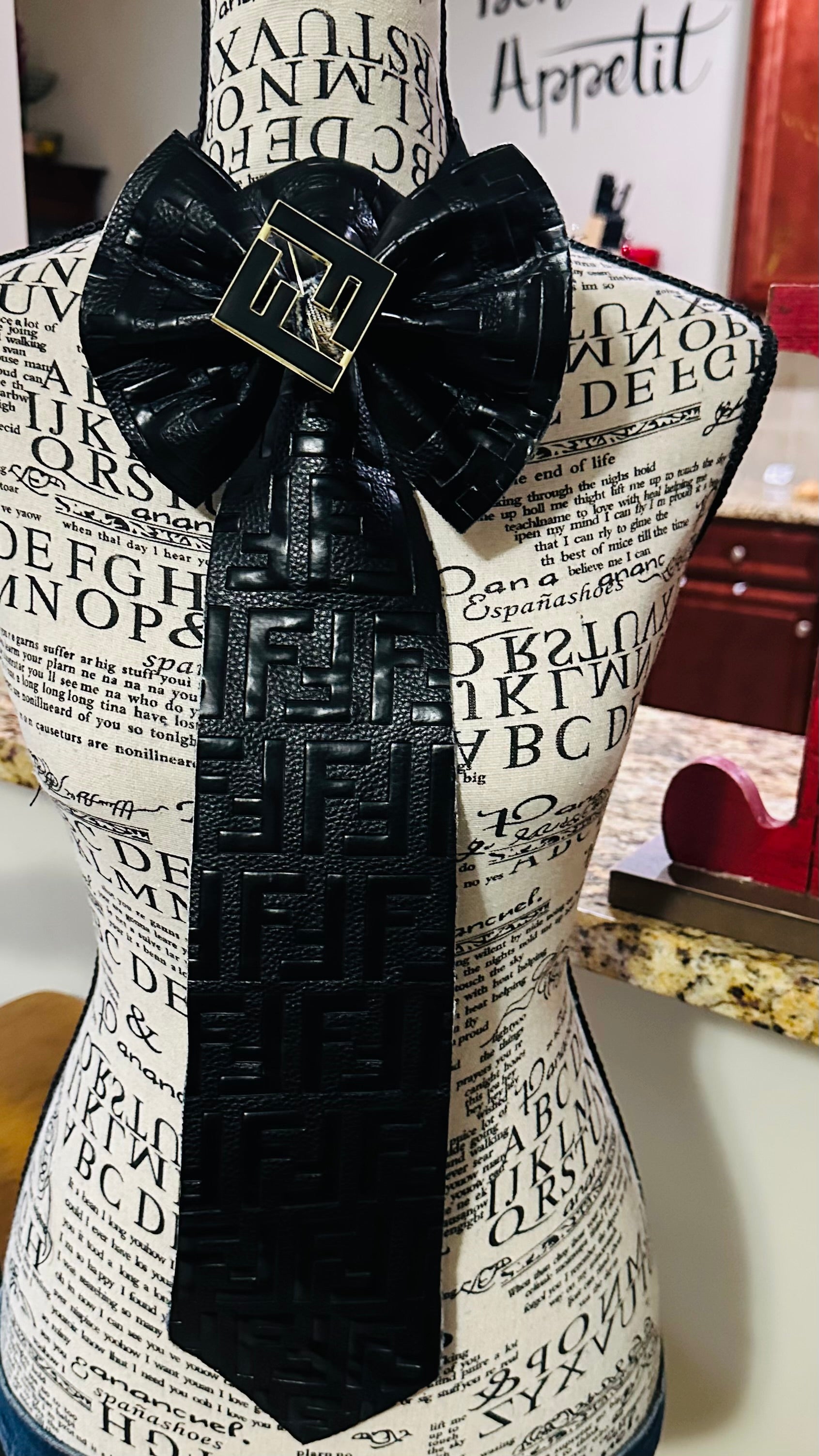 Indulge in ultimate style with our Black Soft Leather & Distressed Denim Fendia Bowtie Necktie. Combining the sophistication of leather and the edginess of distressed denim, this necktie is the epitome of luxury. The center brooch adds a touch of elegance, making it a must-have accessory for any fashionable individual.