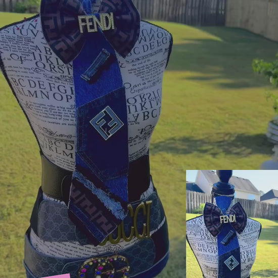 Elevate your style with our Brown Black Distressed Denim Bowtie NecktieWith 2 large brooches. Made with premium distressed denim, this unique bowtie adds a touch of sophistication to any outfit. The textured fabric and bowtie design exude elegance, making it a must-have for those who value luxury and exclusivity. Elevate your fashion game with this one-of-a-kind accessory.