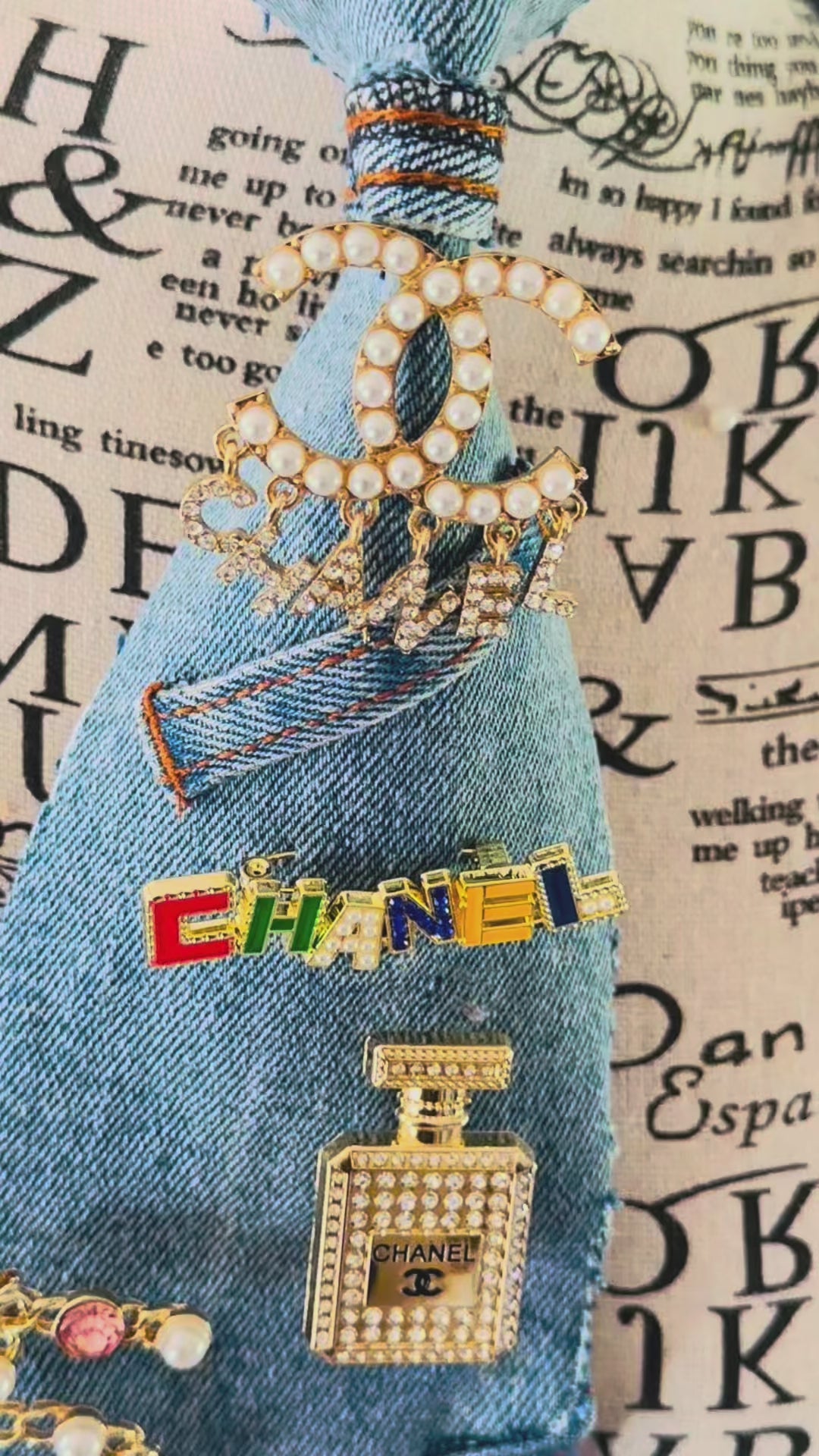 Elevate your style with this Elegant Denim Junk Necktie Necklace, a stunning handmade accessory that blends classic denim texture with refined craftsmanship. Perfect for adding a sophisticated yet casual touch to any outfit, this unique piece showcases expert design and attention to detail, making it a versatile statement for both day and evening wear. (up to 5 brooches & 1 patch)