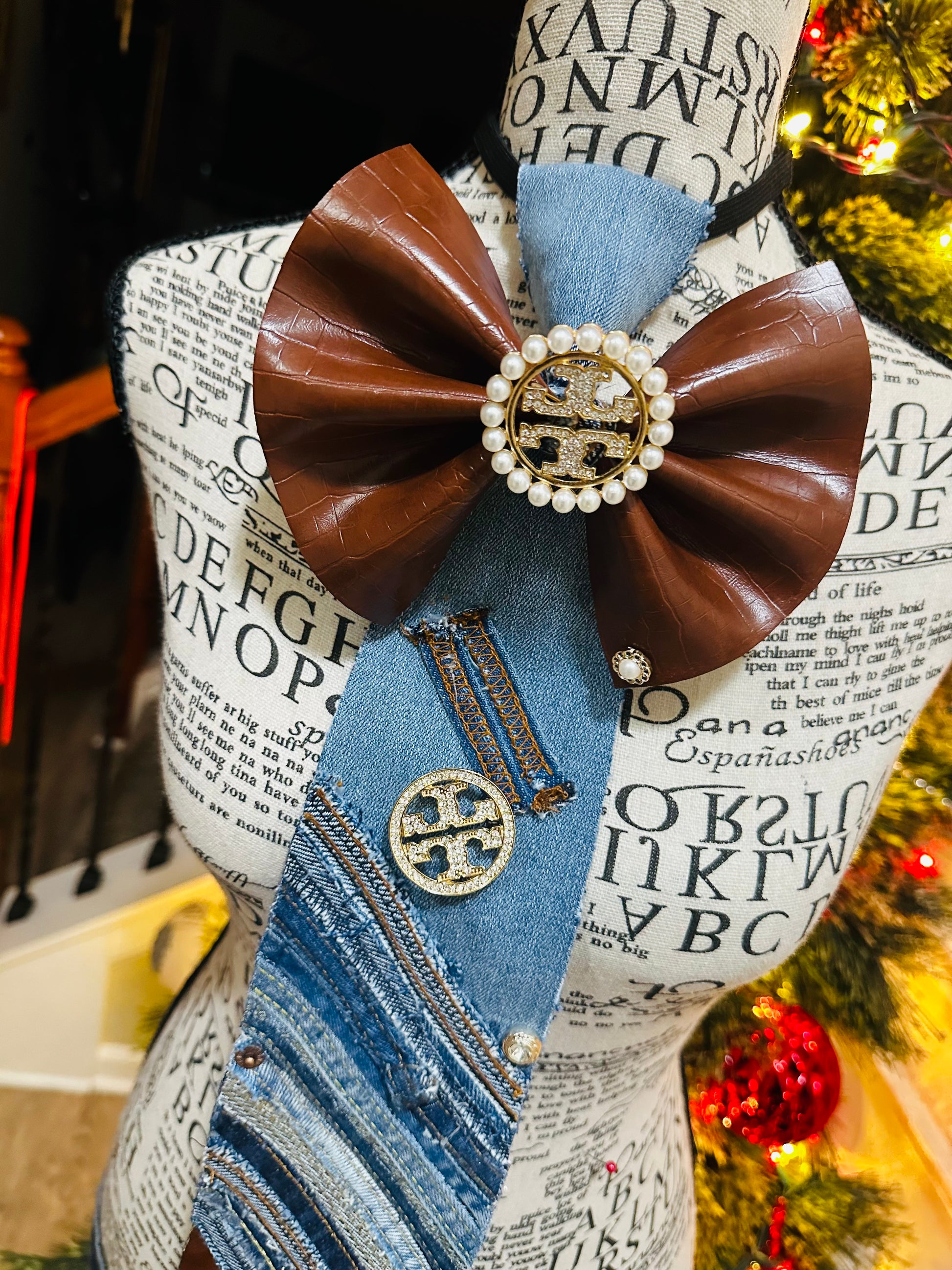 This exclusive TBM Leather Cognac Color Freestyle Patchwork Denim Bowtie Necktie elevates your look with a touch of luxury and sophistication. Handcrafted using premium leather and denim, each bowtie boasts a unique patchwork design for a truly unique and elegant accessory. Make a statement with this tasteful and exquisite necktie.