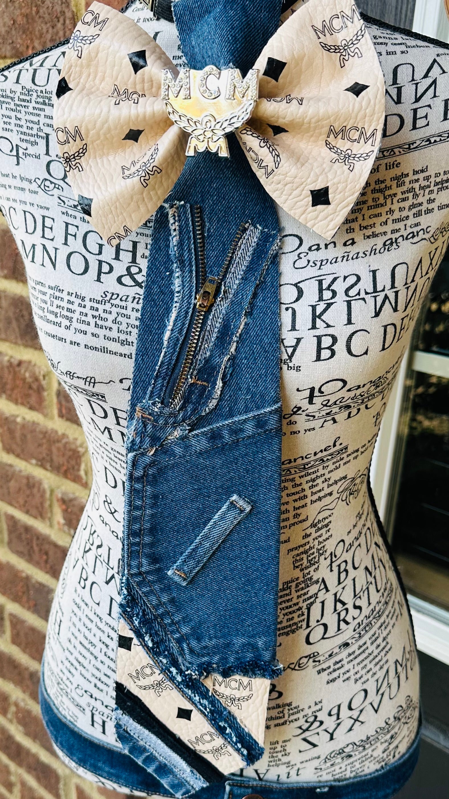 This white leather MGM distressed denim bowtie necktie is a stylish addition to any wardrobe. Crafted with high-quality materials, it offers both durability and a unique vintage-inspired look. Perfect for a formal occasion or a casual outing, this necktie adds a touch of sophistication to any outfit.